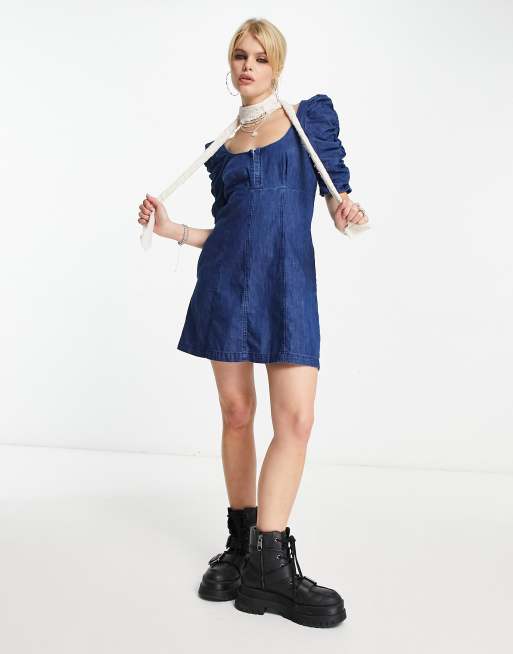 Free People denim puff sleeve mini dress in deep indigo ASOS
