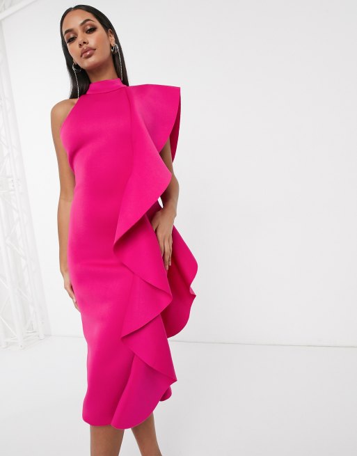 Lavish Alice high neck extreme ruffle midi pencil dress in pink