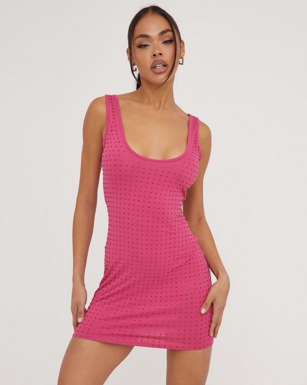 Scoop Neck Diamante Detail Mini Bodycon Dress In Pink Slinky EGO
