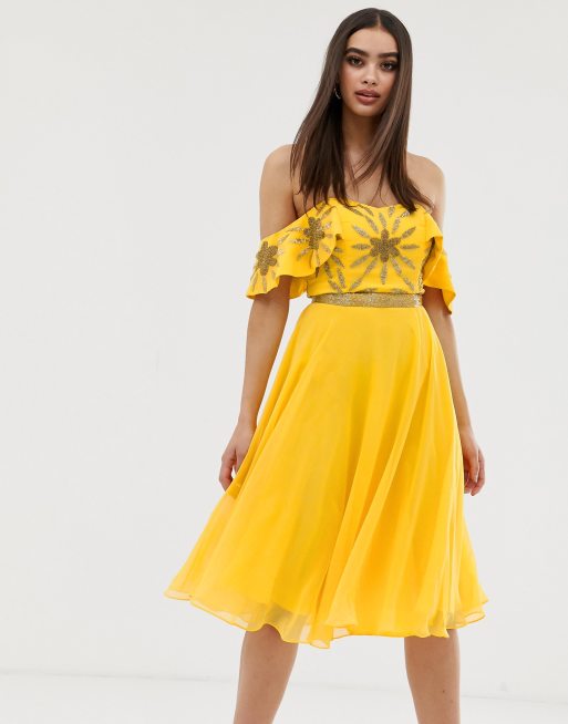 Virgos lounge yellow clearance dress, Yellow embellished off the shoulder virgos lounge Depop clearance