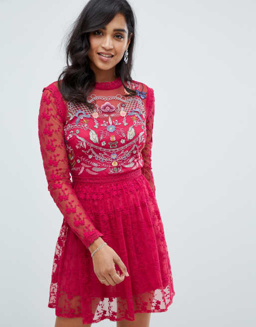 Frock And Frill embroidered lace prom skater dress in berry
