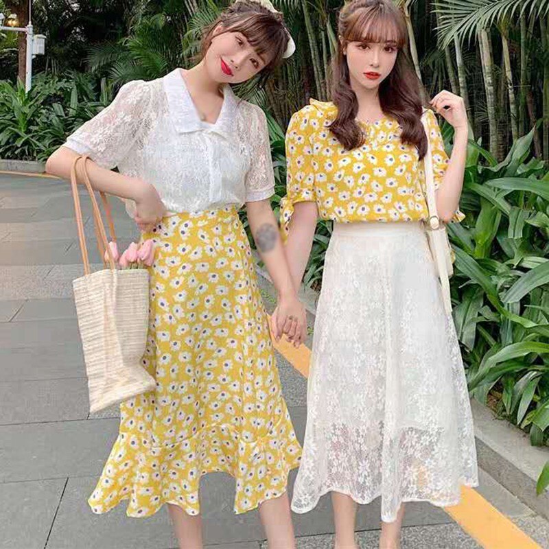 Summer New Yellow Dress Skirt Korean Style Floral Prints Clothing