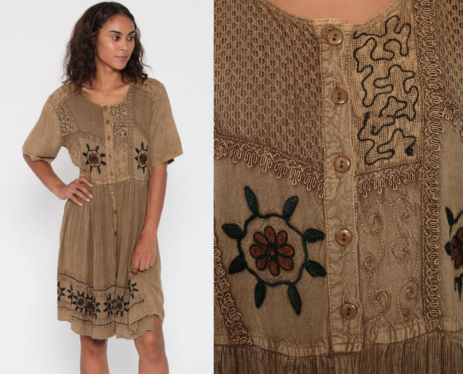 Embroidered clearance hippie dress, Embroidered Hippie Dress 90s Tan High Waisted Button Up Mini clearance