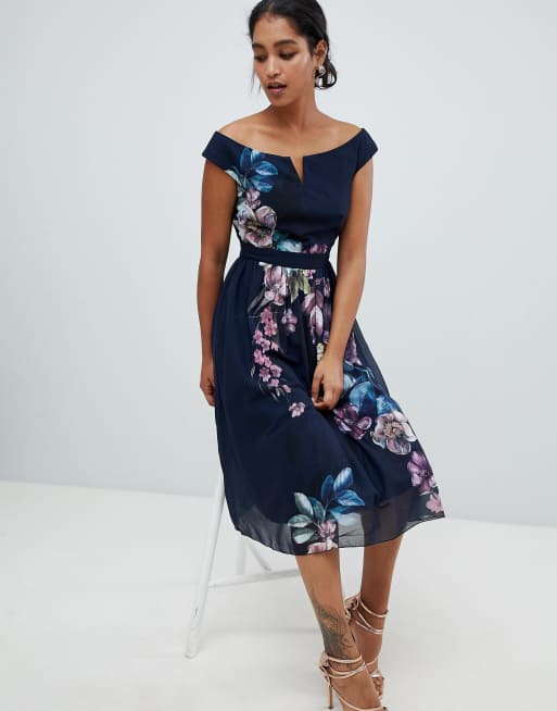 Little Mistress Floral Print Skater Dress With Lace Insert
