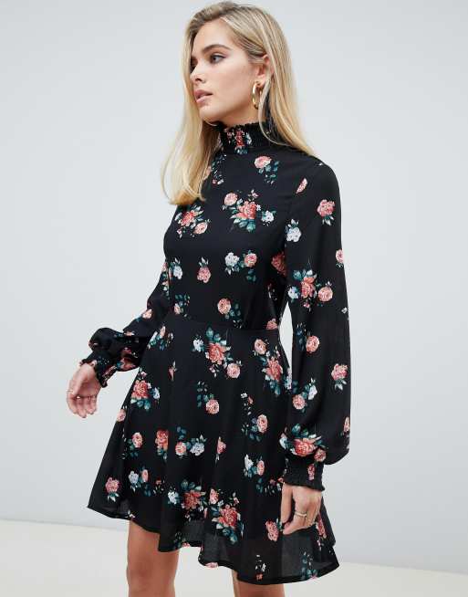 PrettyLittleThing high neck skater dress with frill hem in mono