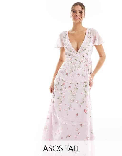 ASOS DESIGN Tall Bridesmaid flutter sleeve embellished wrap maxi dress with embroidery in light pink