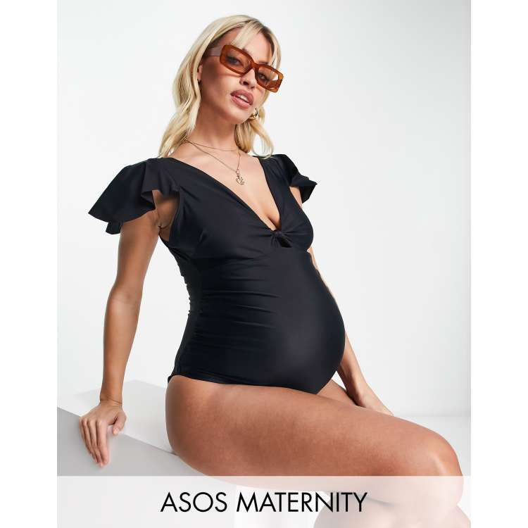ASOS DESIGN Maternity knot front flutter sleeve swimsuit in black