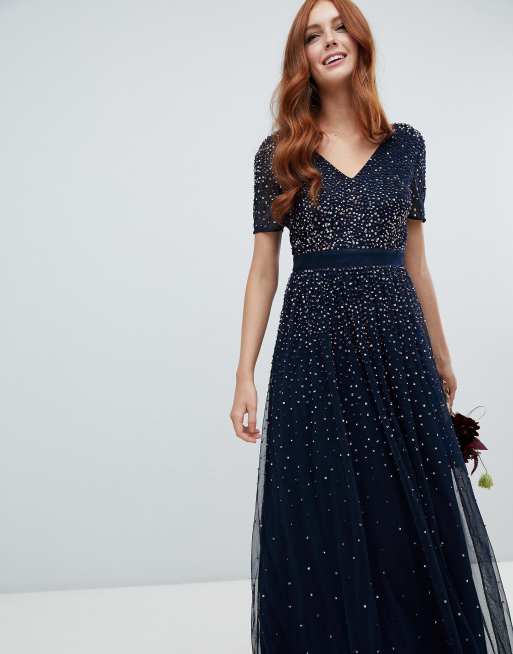 Maya v neck maxi tulle dress clearance with contrast tonal delicate sequins in navy