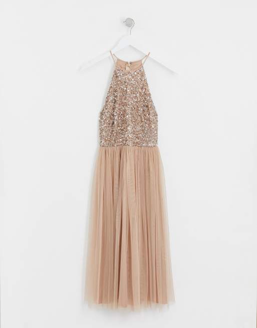 Maya bridesmaid halter neck midi tulle dress clearance with tonal delicate sequins in taupe blush
