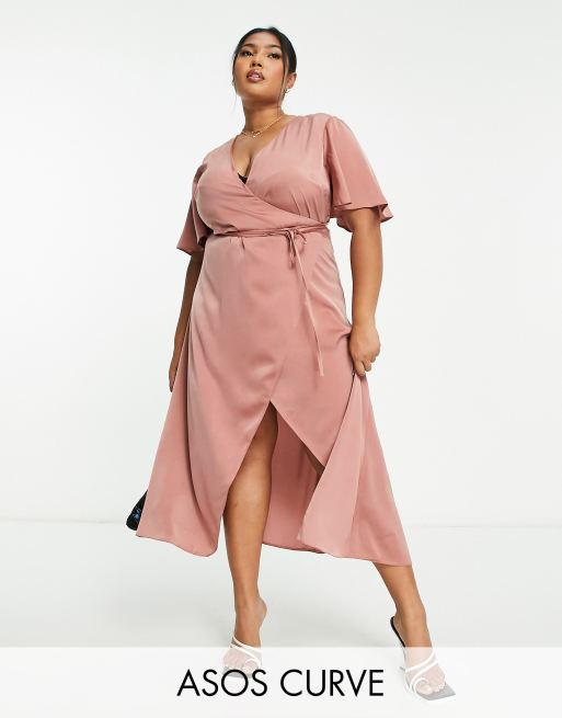 ASOS DESIGN Curve wrap front satin midi dress with tie waist flutter sleeve in brown