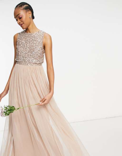 Maya dress taupe clearance blush, Taupe Blush Stripe Embellished Bridesmaid Maxi Dress With Maya Deluxe SilkFred clearance