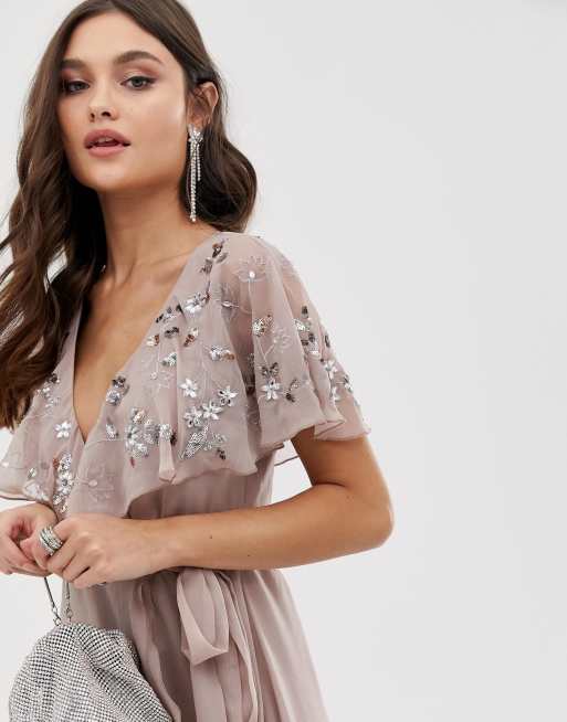 ASOS DESIGN midi dress with cape back and dipped hem in embellishment