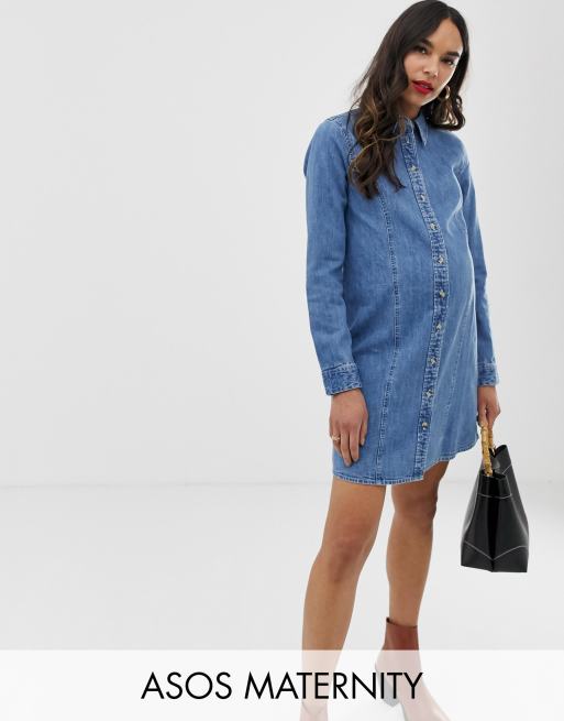 ASOS DESIGN Maternity denim fitted western shirt dress in midwash blue