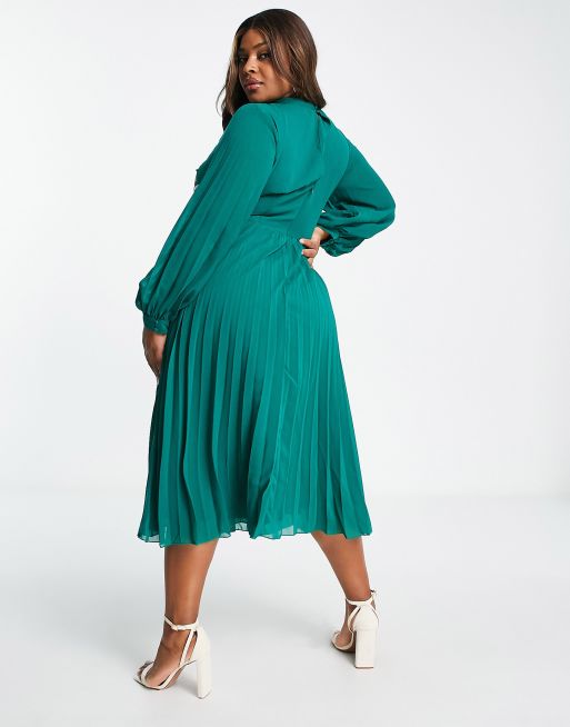 Asos design pleated high clearance neck midi dress with embroidery, ASOS DESIGN Curve high neck pleated long sleeve skater midi dress with embroidery in forest green clearance