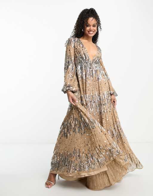 ASOS DESIGN embellished scatter sequin plunge maxi dress with balloon sleeve in taupe