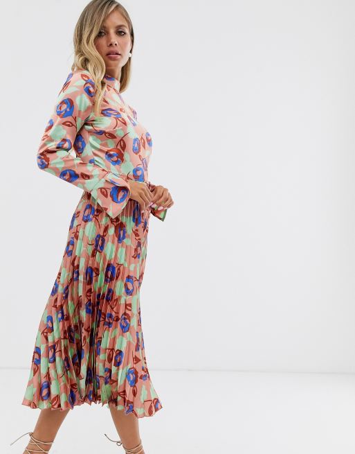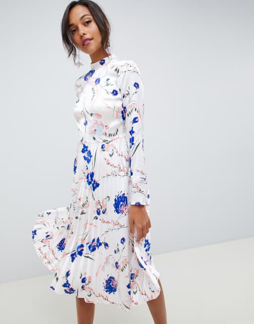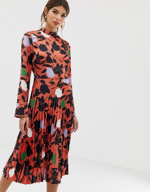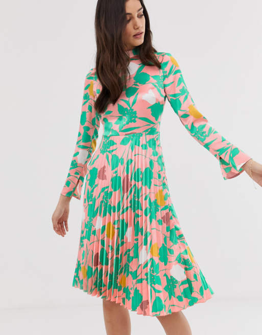 Asos design pleated midi dress with clearance fluted long sleeve in floral print