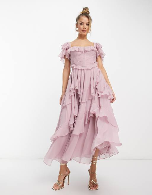 ASOS DESIGN flutter sleeve ruched corset detail tiered midi dress