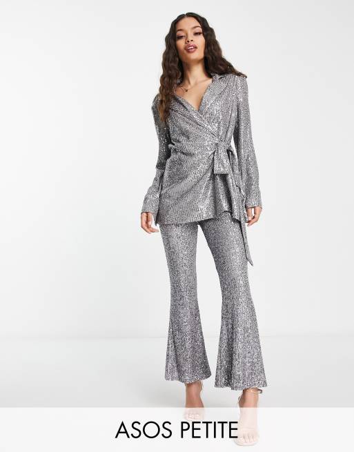 ASOS DESIGN Petite jersey sequin flare trouser in gunmetal ASOS