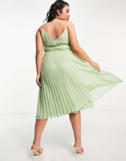 Asos design double layer clearance pleated cami midi dress, ASOS DESIGN Curve pleated cami midi dress with drawstring waist in sage green clearance
