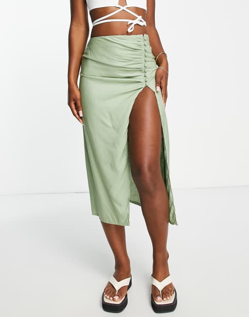 ASOS DESIGN drapey button side thigh split midi skirt in sage green
