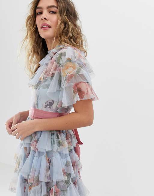 Needle & thread tulle tiered floral clearance midi dress with waistband in dusk blue