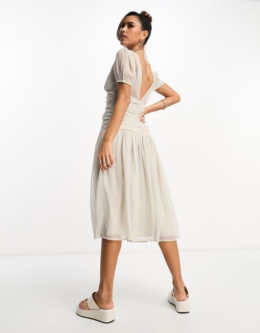 ASOS DESIGN chiffon tie neck ruched waist midi dress in stone