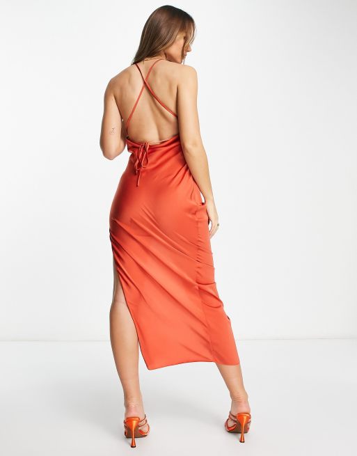 ASOS DESIGN satin halter ruched waist midi dress with high split in ginger
