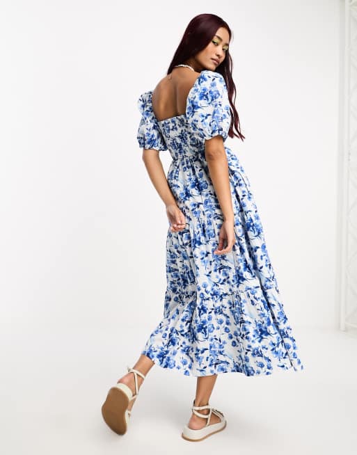 Abercrombie Fitch smocked bodice midi poplin dress in blue floral