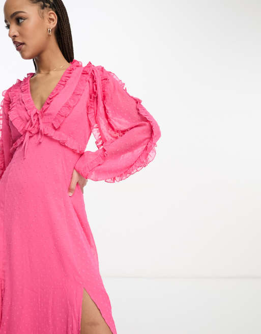 Miss Selfridge dobby chiffon frill detail maxi dress in hot pink