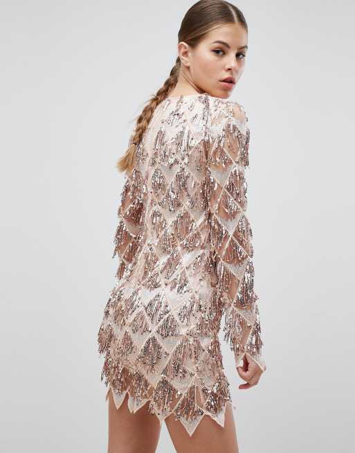 Club L Long Sleeve Tassel Fringe Sequins Plunge Bodycon Dress