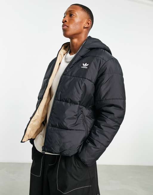 adidas Originals trefoil logo reversible puffer jacket in black and sand