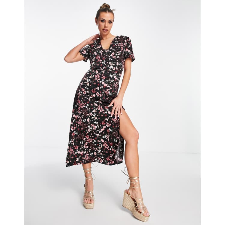Missguided midi tea dress with short sleeve in black floral
