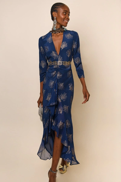 Rose Feather print Ruffled Silk Maxi Dress In Blue