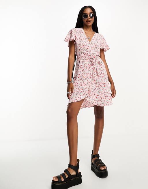 JDY Tall belted wrap mini dress in red and pink floral ASOS