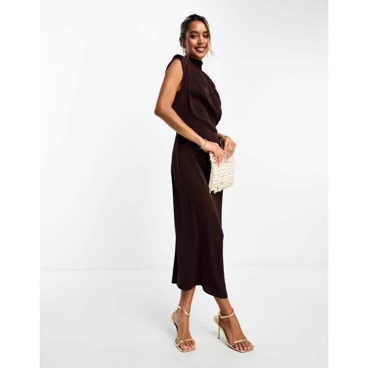 ASOS DESIGN high neck sleeveless midi dress with draped neck in chocolate