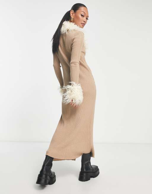 River Island faux fur cardigan midi dress in light brown ASOS