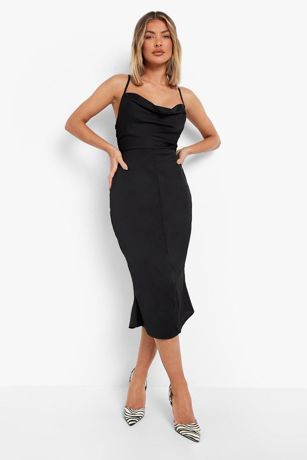 Satin cowl neck lace clearance up fishtail midi dress, Plum Satin Strappy Back Midi Dress clearance