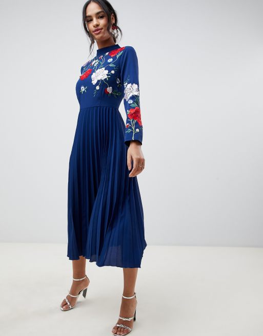Asos design pleated clearance embroidered midi dress, ASOS DESIGN pleated midi dress with embroidery clearance