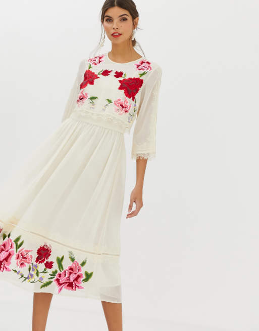 Asos design double layer midi clearance embroidered dress with long sleeves