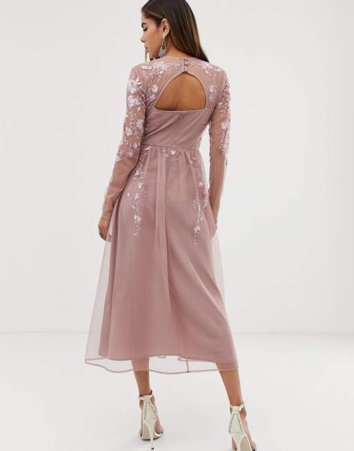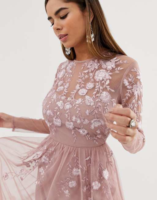 ASOS DESIGN long sleeve embroidered midi dress with lace up back in charcoal