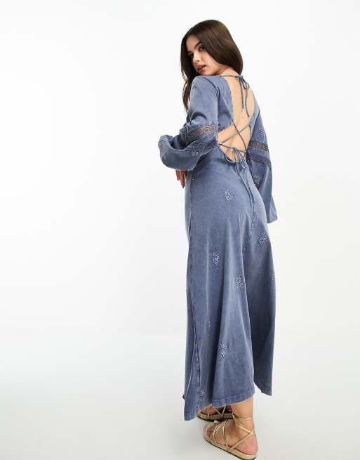 ASOS DESIGN Petite long sleeve embroidered midi dress with lace up back in washed blue