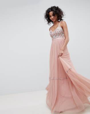 Needle Thread embroidered tulle maxi dress with cami straps in vintage rose