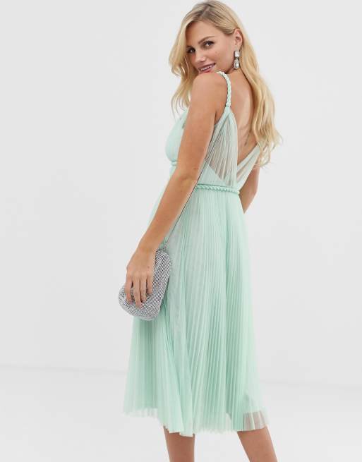 ASOS DESIGN Bridesmaid cami pleated tulle midi dress in Sage
