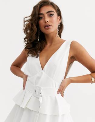 Pretty Lavish deep plung tiered midi dress in white crepe ASOS