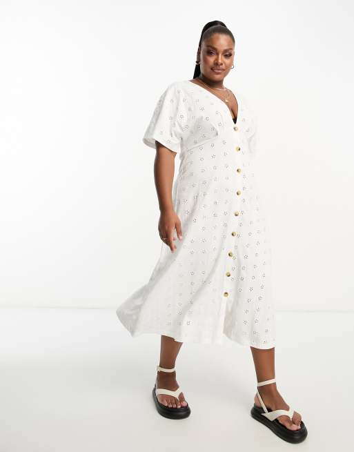 ASOS DESIGN Curve broderie v neck midi dress with buttons in white
