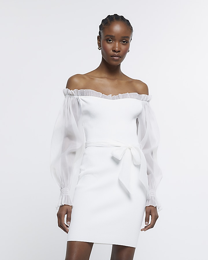 White bardot mesh sleeve bodycon mini dress