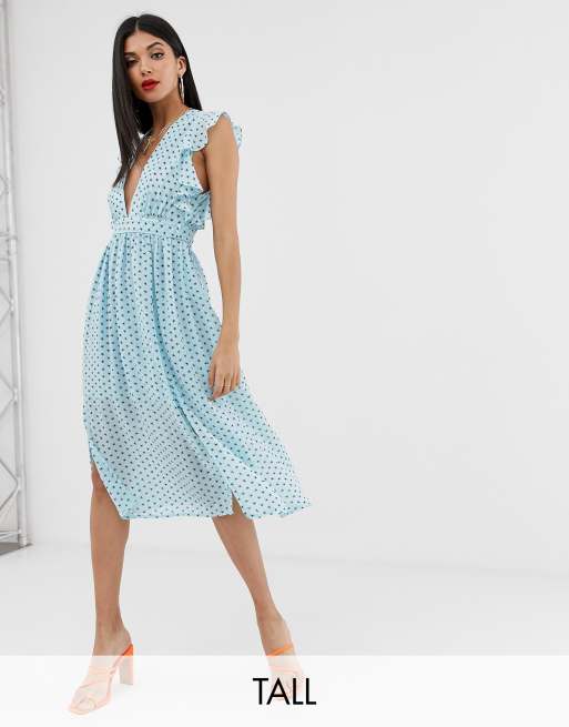 Glamorous plunge front midi dress with ruffle shoulders in smudge spot