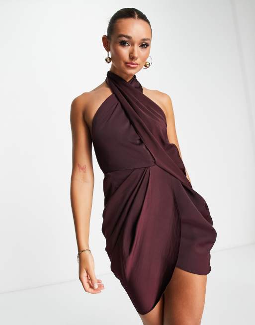 ASOS DESIGN Satin wrap neck drape mini dress in soft washed twill in wine