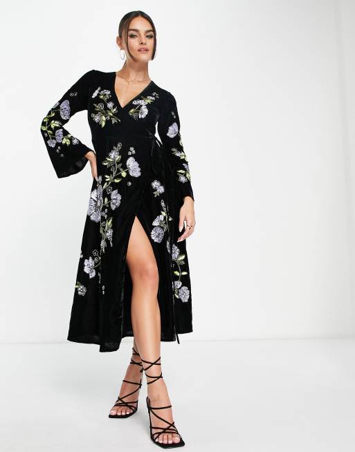 Black floral midi clearance wrap dress, ASOS DESIGN velvet wrap midi dress with floral embellished detail in black clearance