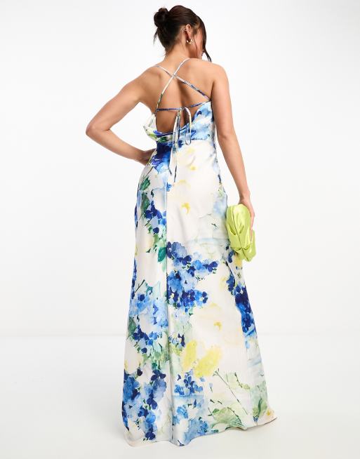 Blue floral dress clearance macys, Hope Ivy cross back satin maxi dress in blue floral ASOS clearance